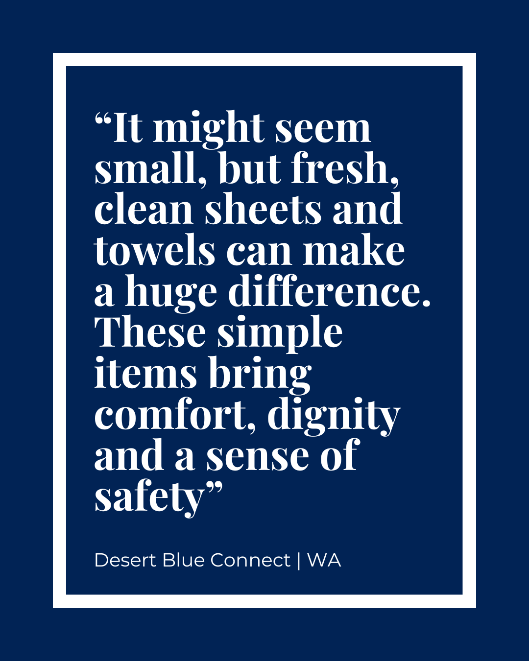 We often hear from our community partners that being able to hand over a brand new set of sheets and a towel is a chance to connect with people in crisis, and a gateway for further support to be provided. It’s a tangible reminder that they are seen, valued, and cared for.